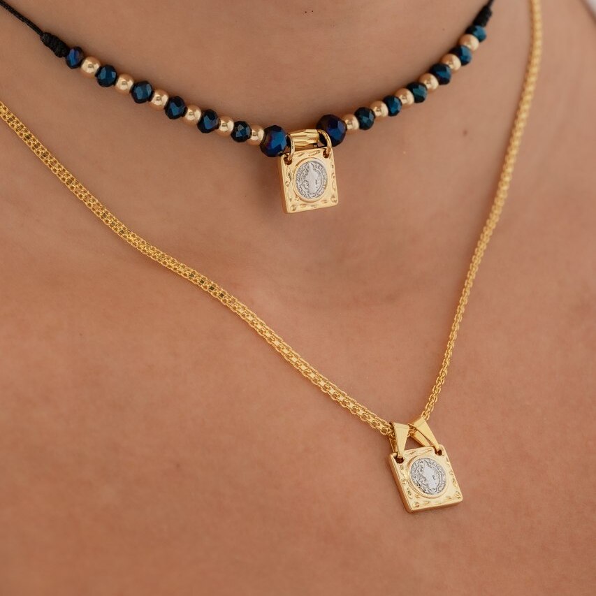 Un diseño doble que une tradición y fe, elaborado en oro laminado 18K, con la poderosa medalla de San Benito como símbolo de protección contra todo mal.